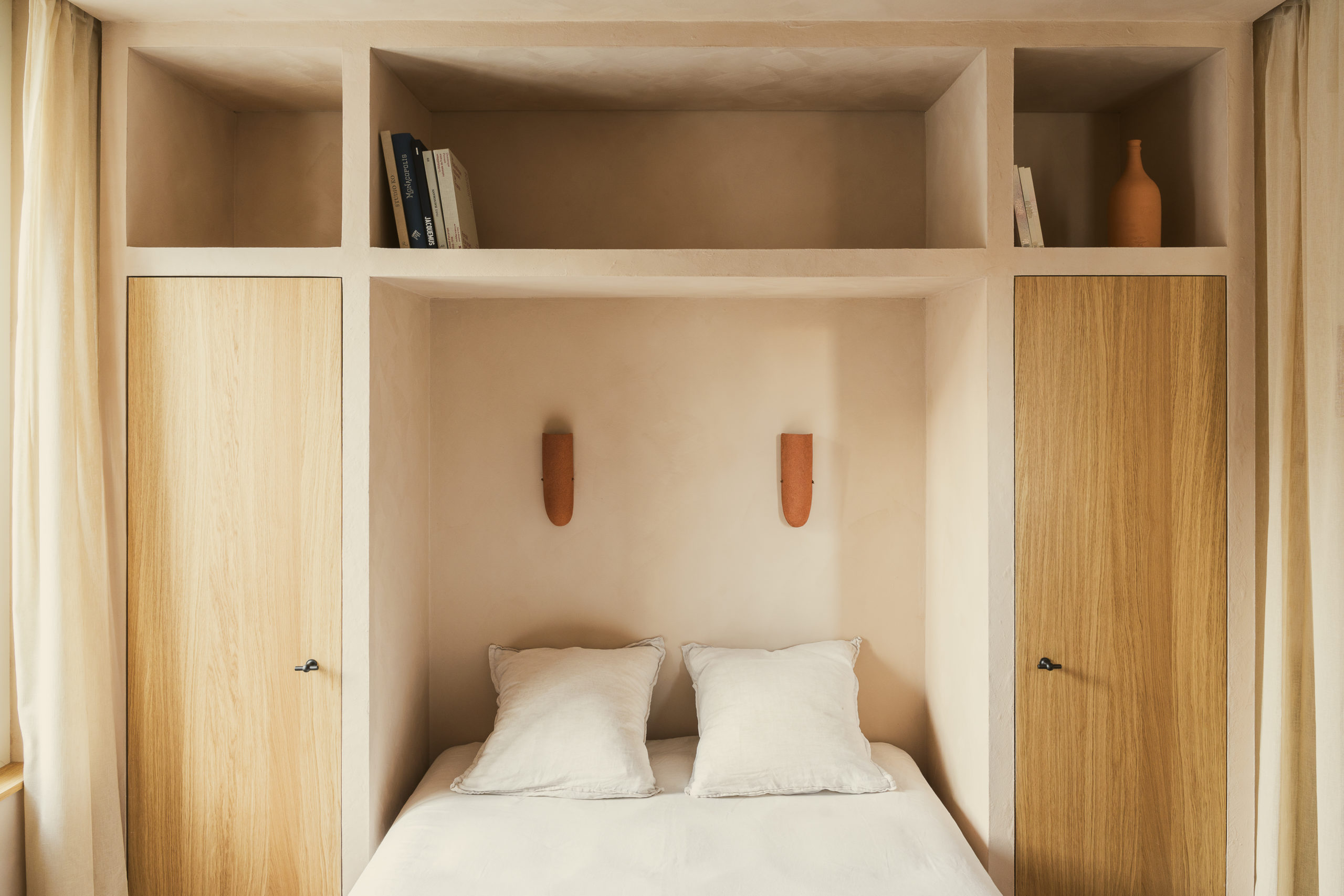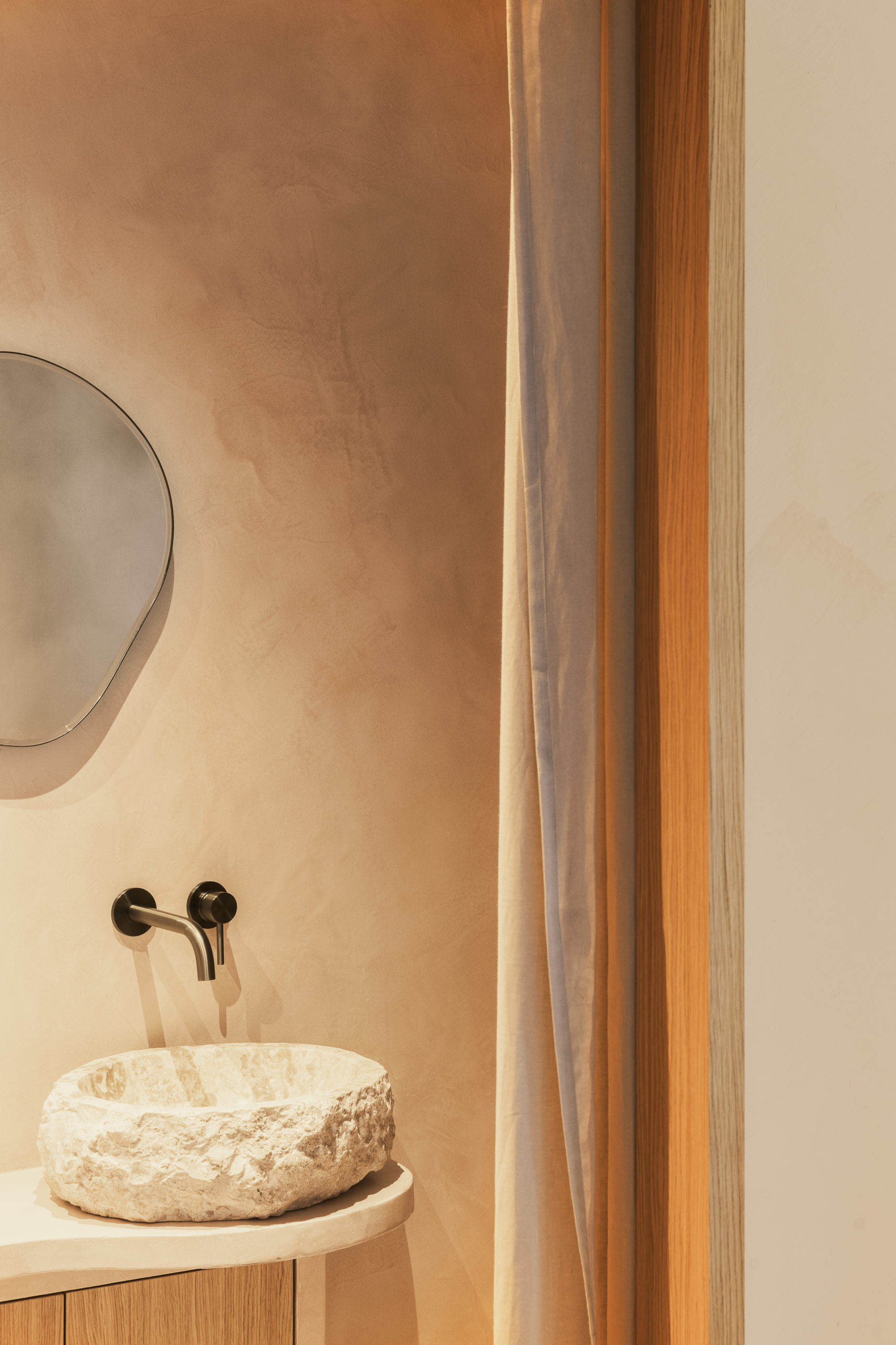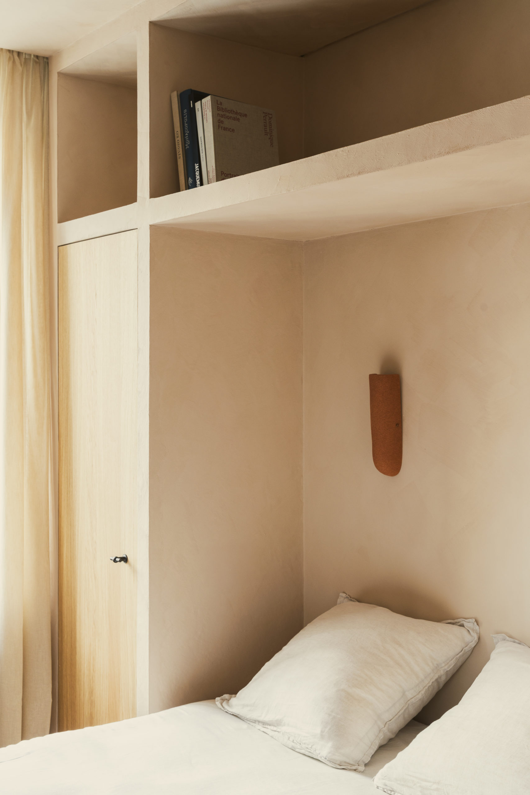 La lumière, filtrée par des voilages en lin naturel, traverse l’appartement avec une douceur changeante, propre au climat méditerranéen, et fait varier la perception des matières. L’espace se construit comme une enveloppe unique où sols, murs et plafonds relèvent d’une même matière minérale, donnant à l’ensemble une continuité plutôt qu’une succession de limites. Le bois intervient lors de séquences spécifiques, comme une présence sensible et chaleureuse qui vient rythmer et préciser cette enveloppe. L’appartement se définit ainsi comme un espace continu, où la matière produit une forme de retrait apaisé du monde extérieur.