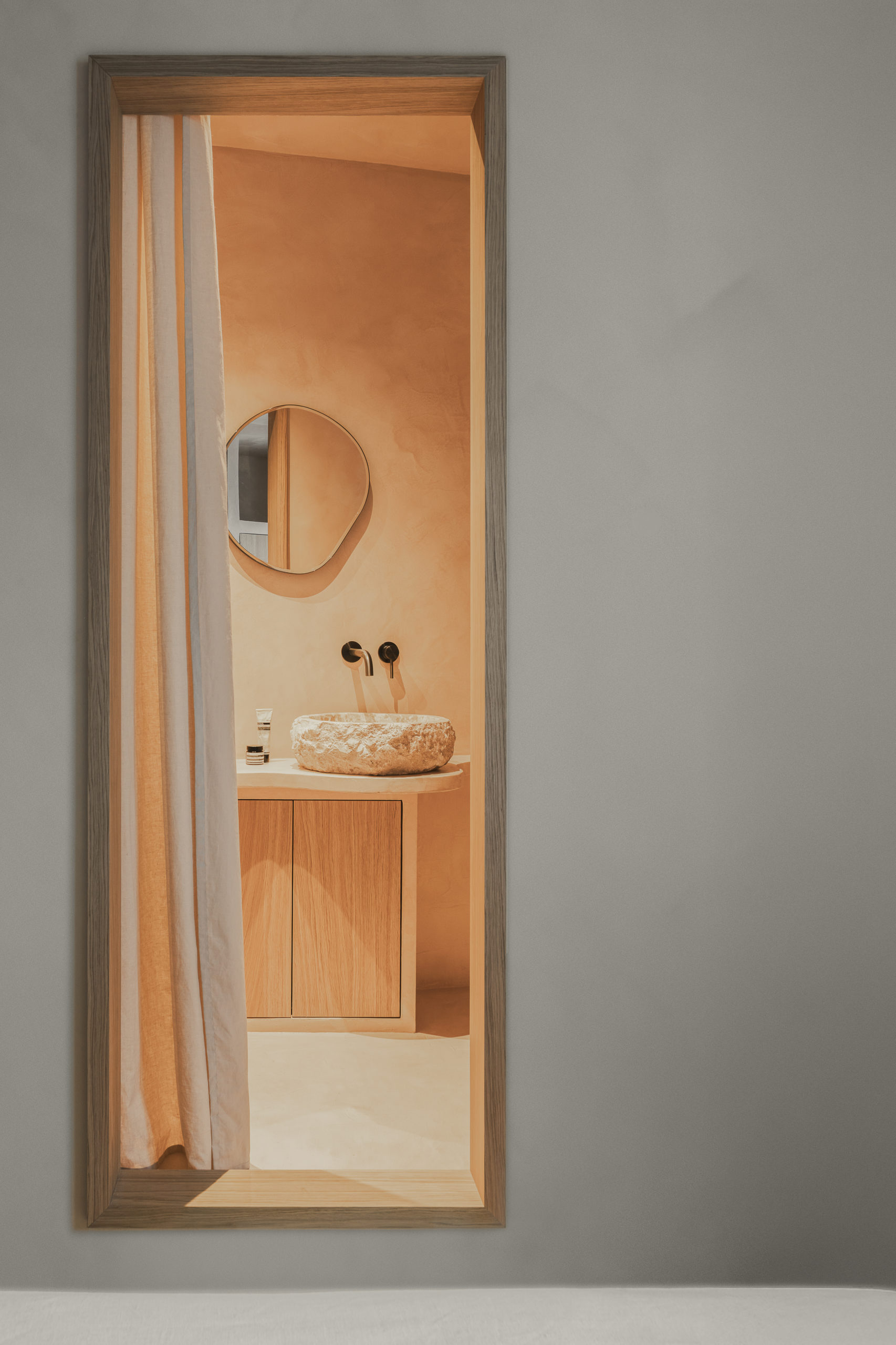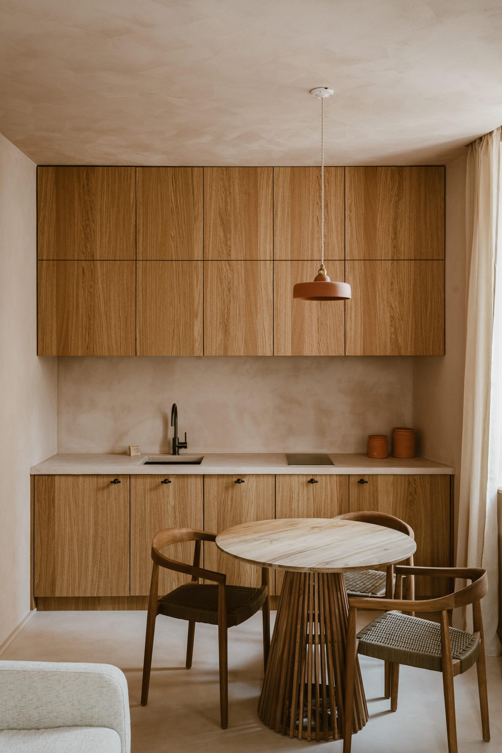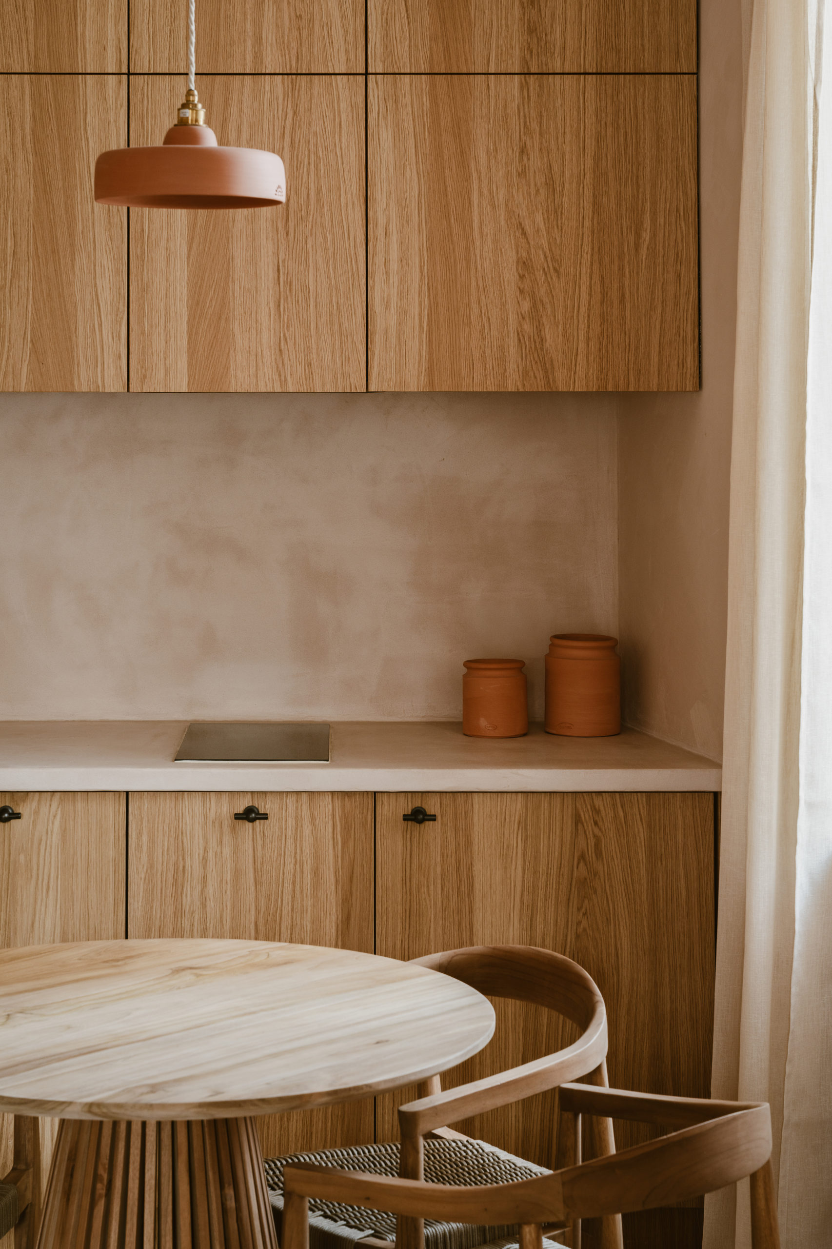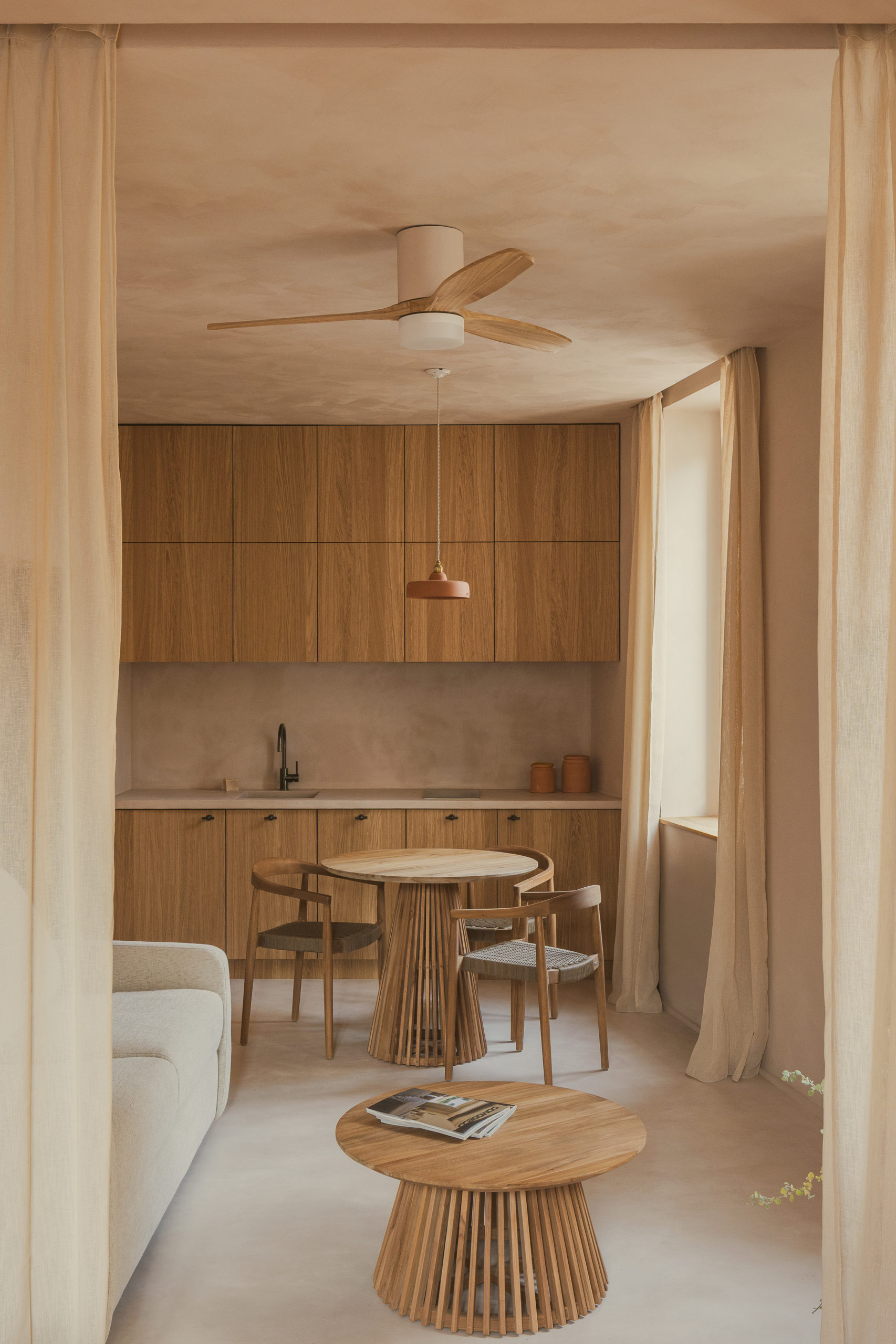 La lumière, filtrée par des voilages en lin naturel, traverse l’appartement avec une douceur changeante, propre au climat méditerranéen, et fait varier la perception des matières. L’espace se construit comme une enveloppe unique où sols, murs et plafonds relèvent d’une même matière minérale, donnant à l’ensemble une continuité plutôt qu’une succession de limites. Le bois intervient lors de séquences spécifiques, comme une présence sensible et chaleureuse qui vient rythmer et préciser cette enveloppe. L’appartement se définit ainsi comme un espace continu, où la matière produit une forme de retrait apaisé du monde extérieur.